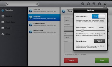 Vault is an intuitive, secure and feature rich password keeper that simplifies management of all your confidential and sensitive information related to websites, email accounts, cards, bank accounts, etc. Vault uses a strong data encryption standard and comes with features such as "Auto Destruct" and "Auto Logout" so you are guaranteed that your data is safe. Even the UI has been designed to make it easy for you to access your data and keep it safe from prying eyes.